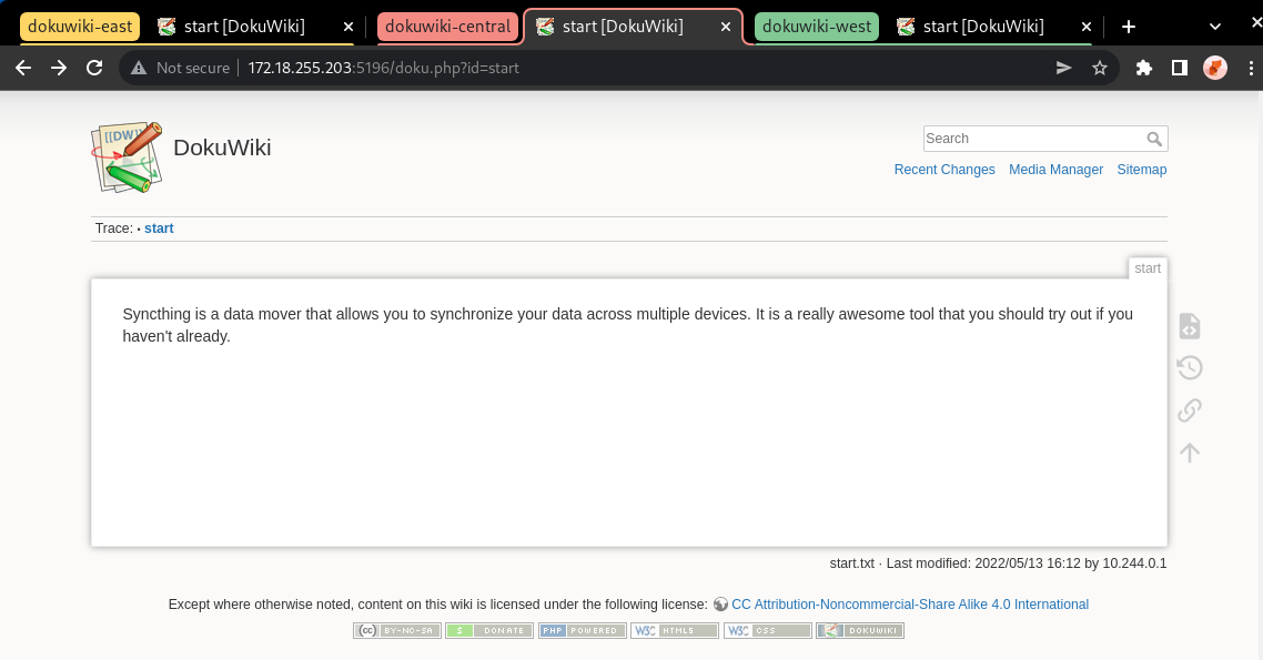 In this example, we will demonstrate how Syncthing can be used to maintain a synchronized volume across several Dokuwiki application instances.