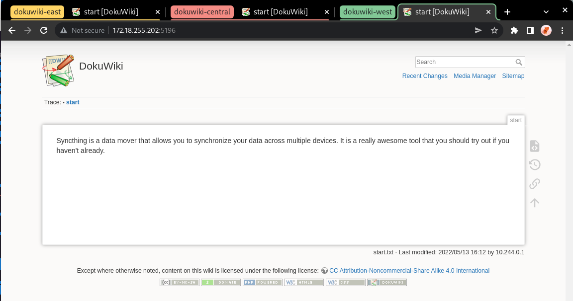 This will create Syncthing-based ReplicationSources in both namespaces configured to sync the PVC which stores DokuWiki’s data.